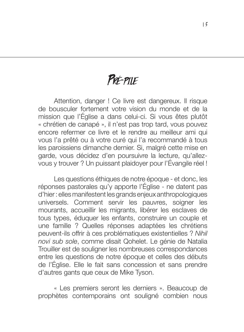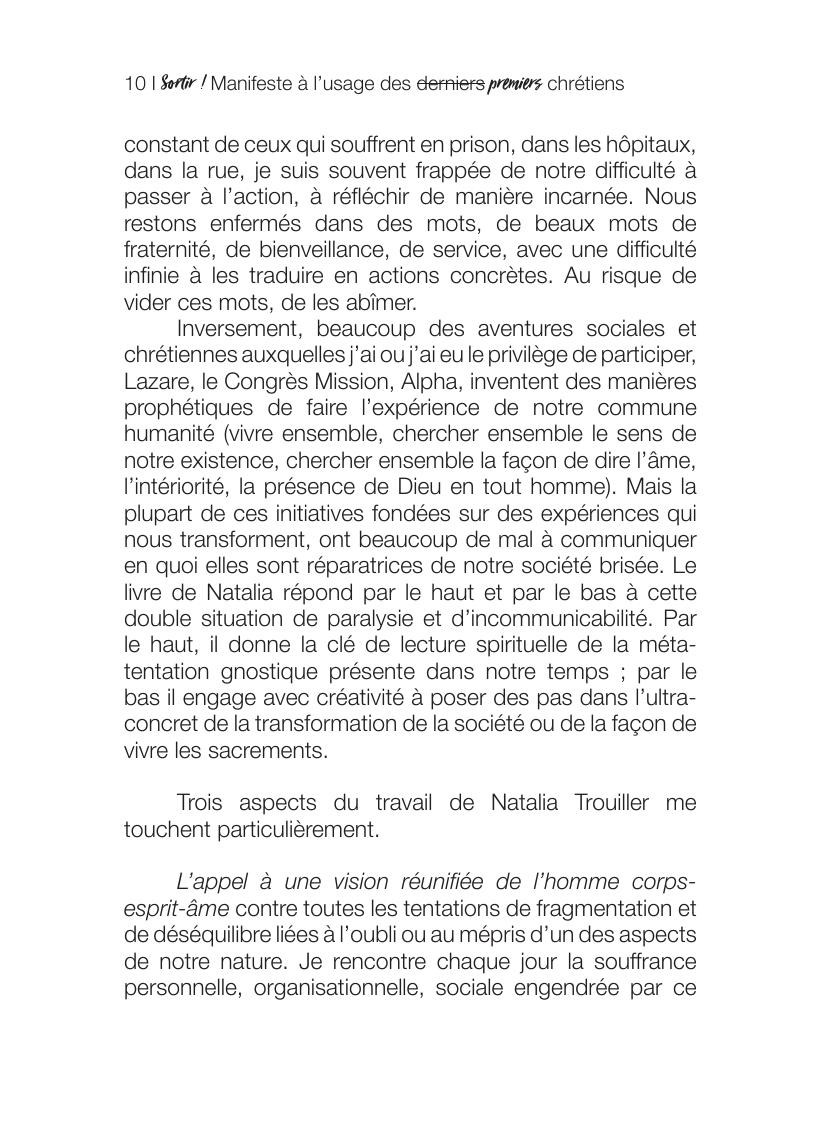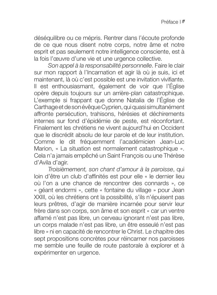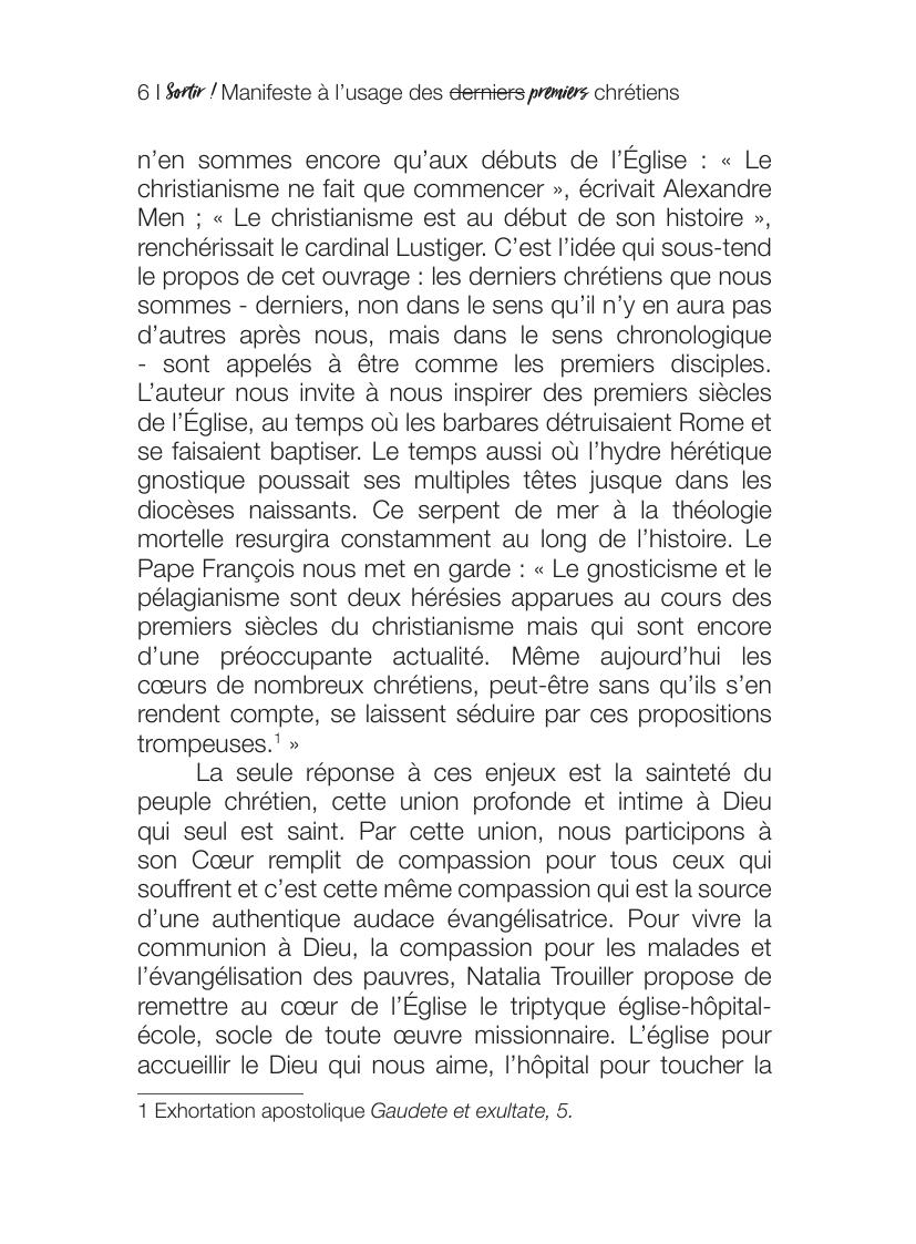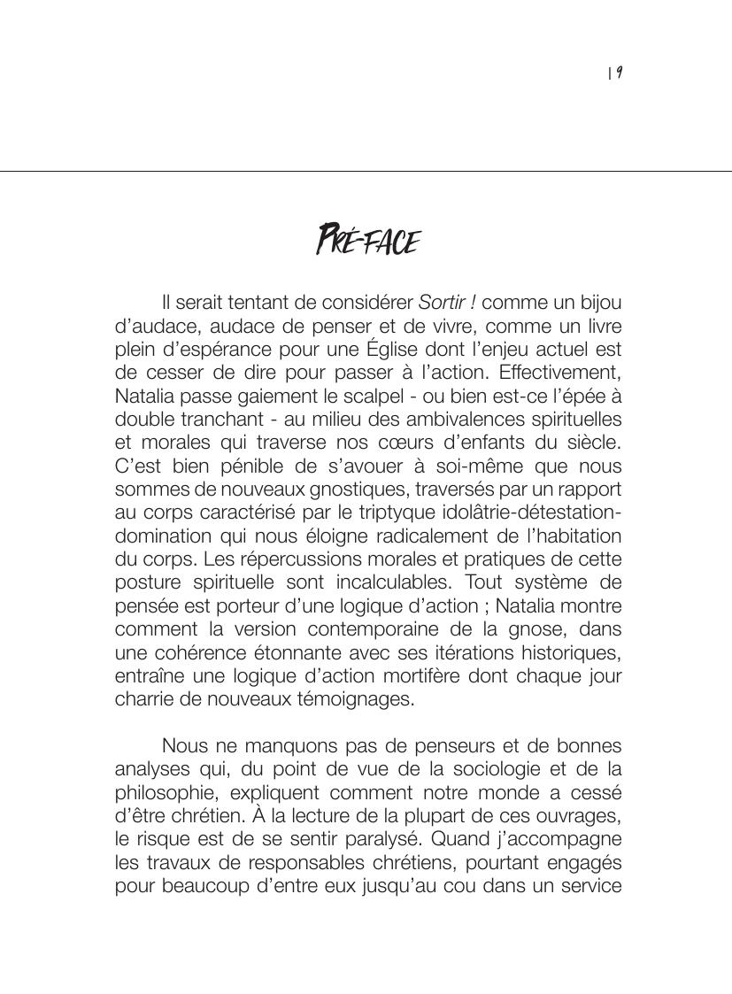 Face à ce constat d’échec, l’auteur appelle les catholiques à renouer avec la dimension incarnée de la religion chrétienne. Elle dénonce leur dérive vers gnosticisme à la manière du monde contemporain qui valorise le corps tant qu’il est sain, en bonne santé et esthétique. Ses parallèles constants avec les hérésies des premiers siècles révèlent que cette dérive n’est pas nouvelle et qu’il y a déjà bien longtemps les Pères de l’Eglise y avait répondu. Elle rejoue donc les controverses de ces siècles lointains avec les interrogations d’aujourd’hui à l’exemple de celles posées par la numérisation de nos existences.
